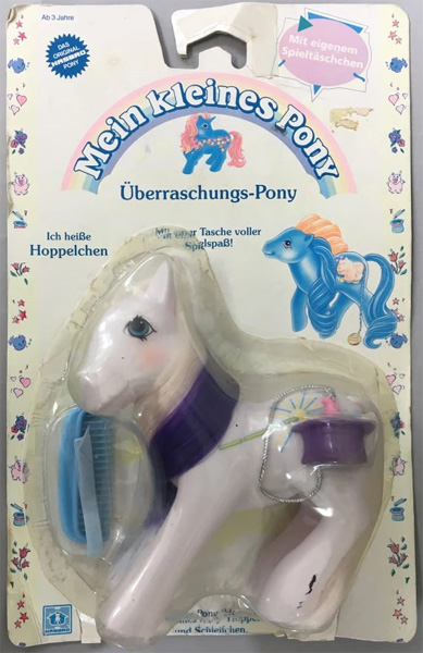 Geschichte:„"Hallo, Hoppelchen! Wir haben dir ein kleines Geschenk für deine lustige Spieltasche mitgebracht!" begrüßten mich eines Tages die Babyponys und kicherten. Natürlich wollte ich sofort wissen, was es ist, denn ich bin ziemlich neugierig. Es war eine Karotte, und ich konnte mir schon denken, für wen sie bestimmt war. Sanft berührte ich mein Täschchen, das übrignes aussieht wie ein Zauberzylinder. Es dauerte nicht lange, da lugte auch schon mein neidliches Häschen aus dem Zylinder heraus. Es freute sich sehr über die Karotte und die Babyponys waren glücklich, denn sie liebten mein Häschen genauso wie ich.“