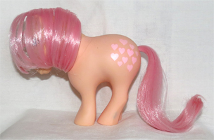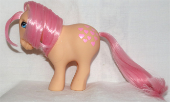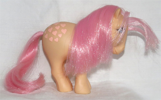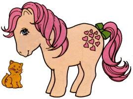 Geschichte von Pfirsichblüte (Comic):„Ich bin sehr eitel, liebe schöne Kleider und atemberaubende Hüte. In meinem Schönheitssalon duftet es immer herrlich nach Jasmin und Rosen und deswegen kommen alle kleinen Ponys furchtbar gern zu mir. Einmal habe ich sogar bei einem Schönheitswettbewerb gewonnen. Darauf war ich sehr stolz. Ich musste ein Lied vorsingen, ein Gedicht vortragen und einen selbst entworfenen Hut vorführen. Und weil ich am meisten Applaus bekam, wurde ich Siegerin!“