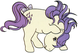 Lemon Drop / Zitrönchen mit Hund Brandy / Brandy kamen mit dem Ponyhaus. Sie ist gelb und hat lila Haare. Ihre Symbole sind lila Tropfen.