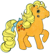 Geschichte (Comic):„Ich bin ein sehr tolpatschiges Pony. Ich stolpere ständig und bin schrecklich neugierig. Deshalb drehe ich mich beim Laufen über die Wiesen immer wieder um damit ich sehe was hinter mir passiert. Dabei habe ich schon viele Zäune im Ponyland umgeworfen. Ich esse am allerliebsten Äpfel und bin meistens auf der Apfelbaumweide zu finden.“