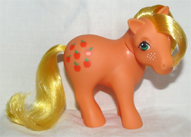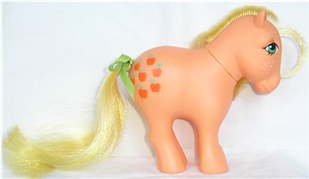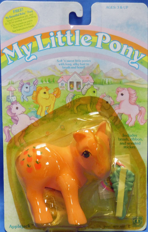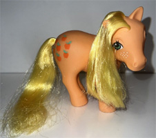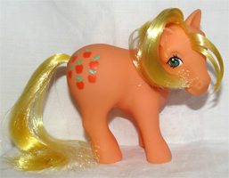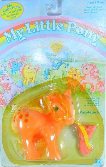 Applejack / Apfelbäckchen ist orange und hat gelbe Haare. Ihre Symbole sind Äpfel. Es gibt sie in zwei verschiedenen Stellungen.