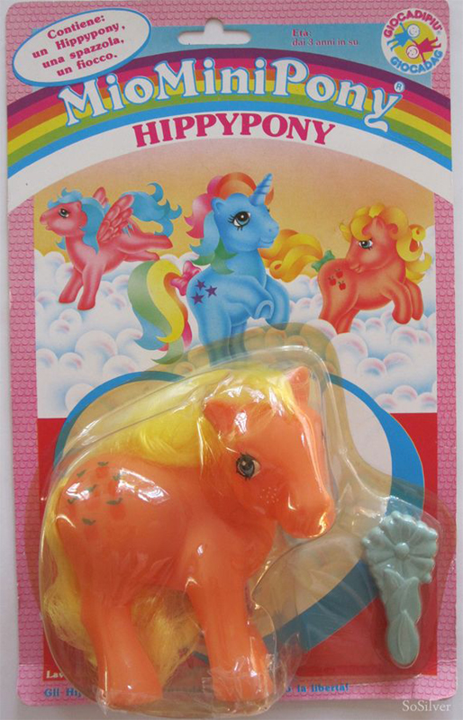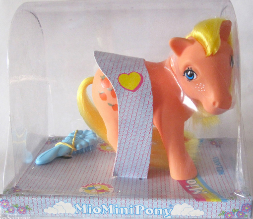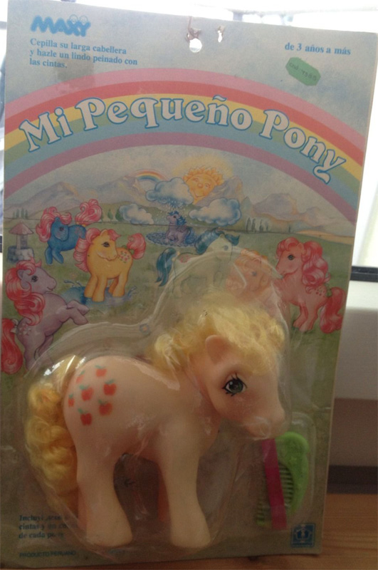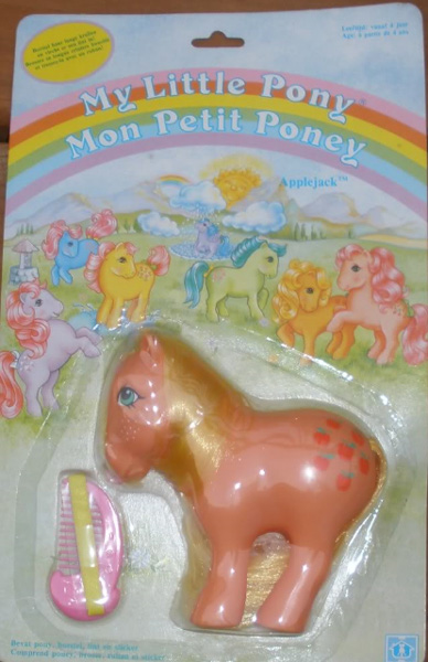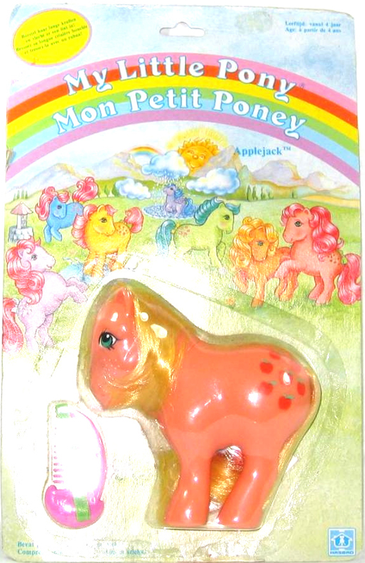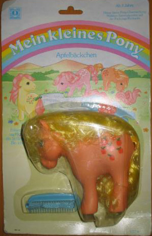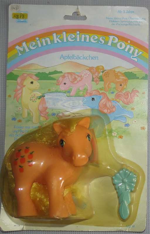 Geschichte auf der Packung USA:„Bubbles was racing down the hill looking for a muddy spot to roll in. She stopped suddenly and laughed. "What a silly sight," she said. Hanging upside down in a tree like a monkey was Applejack. "How did you get up there?" asked Bubbles. Applejack whinnied in embarrassment. "I was jumping for apples. I jumped so high that I caught my heels on the branch." Bubbles sighed. "Your appetite for apples is always getting you in trouble, Applejack!" Then she helped Applejack out of the tree, and was treated to a fine red apple from her thankful friend. “