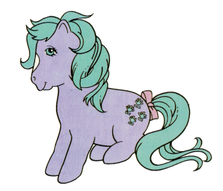 Seashell / Perlmuschel ist lila und hat grüne Haare, es gibt sie mit und ohne Blesse. Sie sitzt und hat als Symbole Muscheln.