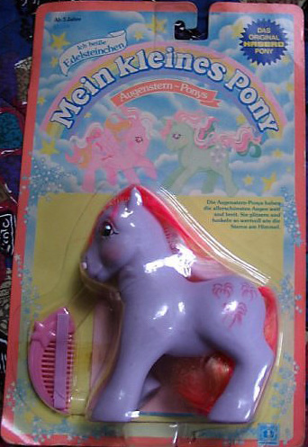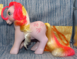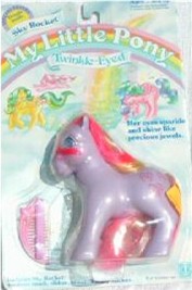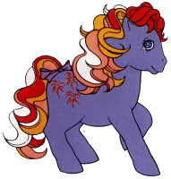 Sky Rocket / Edelsteinchen ist lila und hat rot- gelb- weiß- rosa Haare. Als Zeichen hat sie Feuerwerke.