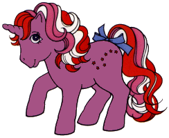 Galaxy / Galaxia hat ein Horn, ist pink und hat rot- helllila- weiß- orange Haare. Als Zeichen hat sie das Sternbild "großer/kleiner Wagen".