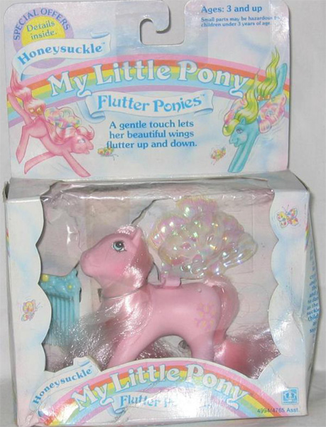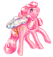 Honeysuckle / Honigschlecker ist rosa und hat rosa Haare. Ihre Symbole sind Blüten, die als Schneeflocke angeordnet sind.