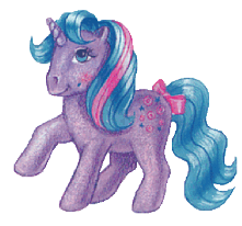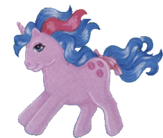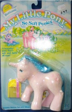 Buttons / Knöpfchen ist rosa mit blauen Haaren und einer pinken Strähne. Sie hat ein Horn und als Zeichen Knöpfe und Sterne.