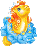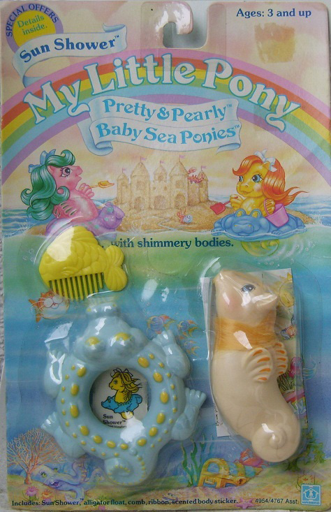Sun Shower / Baby Sandkörnchen ist gelb und hat gelbe Haare. Ihr Reifen stellt ein blau- gelbes Krokodil dar.