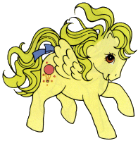 Lofty / Stölzchen ist gelb mit gelben Haaren. Sie hat Flügel und als Zeichen einen Heißluftballon.