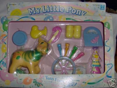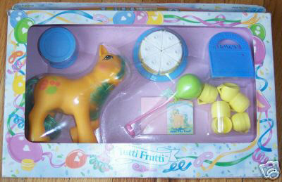 Tutti Frutti / Tutti ist gelb und hat grüne Haare mit einer gelben Strähne. Als Zeichen hat sie einige Früchte.