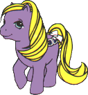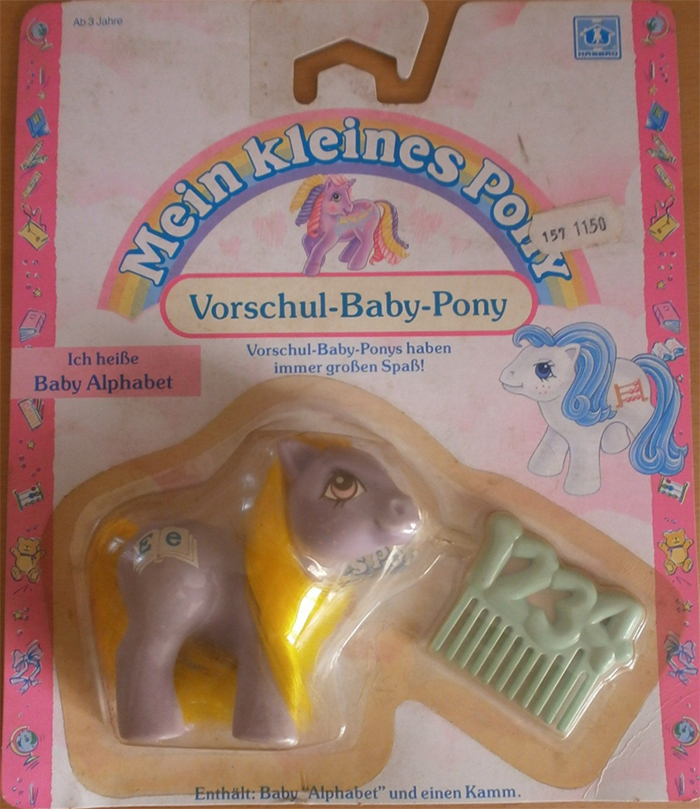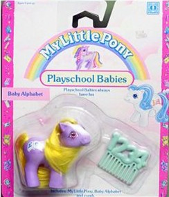 Baby Alphabet / Baby Alphabet ist lila und hat gelbe Haare. Sie hat als Zeichen ein Buch mit den Buchstaben e E auf den Seiten.
