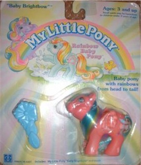 Baby Brightbow / Baby Buntlicht hat Flügel, ist pink und hat grün-gelb-lila Haare. Ihr Symbol ist ein senkrechter Regenbogen umrundet von Sternen.