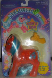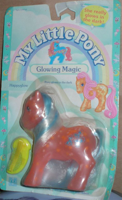 Geschichte der UK-Verpackung: „Happyglow war gerade damit fertig geworden, ein lustiges Lied für ihre Freunde zu singen. „Wenn ihr euch alle glücklich fühlt, möchte ich, das ihr mit euren Nasen und Ohren wackelt!“ sagte sie zu ihnen. „Wir haben keine Nasen und Ohren, und glücklich fühlen wir uns auch nicht,“ sagten einige glanzlos aussehende Sterne, die vom Himmel herunter geschwebt kamen. „Niemand kann uns sehen. Der Sternenerleuchter (Star Lighter) ist so beschäftigt damit, mit seiner Nase und seinen Ohren zu wackeln, dass er vergessen hat uns zu erleuchten!“ Happyglow rief den Sternenerleuchter (Star Lighter) und er beeilte sich die Sterne zu erleuchten. „Leuchtzauber!“ sagte er. Sein Zauberwort muss auch auf Happyglow gewirkt haben. Denn jetzt… Happyglow leuchtet im Dunkeln. Sie ist ein Leuchtzauber Pony!“