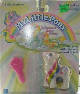 Baby Starbow / Baby Himmelsstern ist weiß und hat pink-gelb-blaue Haare. Ihr Symbol ist ein Regenbogen umrundet von Sternchen. Es gibt sie auch mit einer lila statt einer blauen Strähne.