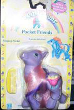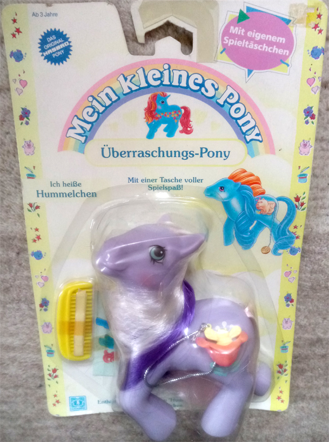Geschichte:„Als wir Überraschungsponys ganz neu im Ponyland waren, gaben die Ponys ein großes Fest für uns. Alle fieberten diesem Tag entgegen, denn sie wollten unbedingt wissen, wie ich gleichzeitig reden und singen konnte. Da ich beschlossen hatte, mein Geheimnis mit den anderen zu teilen, rief ich alle meine Freunde zu mir, berührte vorsichtig mein Täschchen und mit einem Mal schwirrten laut brummend einige Hummeln heraus. Nun wussten alle, dass in meiner Blumentasche viele kleine Hummeln wohnen. Und da sie die ganze Zeit miteinander reden, klingt es für uns wie wundervoller Gesang. Deshalb hatte es sich immer so angehört, als ib ich gleichzeitig reden und singen würde.“