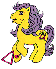 Musictime / Melodie ist gelb und hat lila Haare. Sie hat eine Triangel als Symbol.