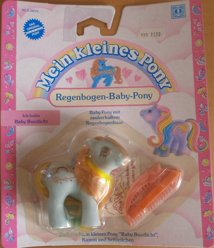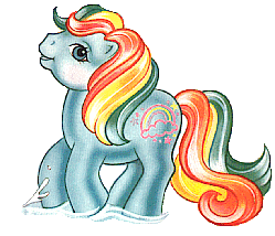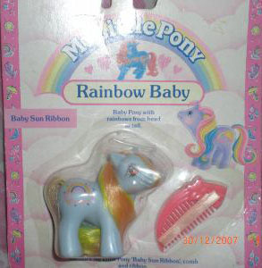 Baby Sunribbon / Baby Regenschleifchen ist blau und hat orange-gelb-blaue Haare. Ihr Symbol ist ein Regenbogen mit einer Wolke.