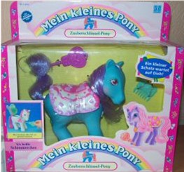 Secret Beauty / Schimmerchen ist blau und hat lila Haare. Sie hat u.a. Herzen auf ihrer Decke. Sie hat wahrscheinlich einen Ring mitgebracht.