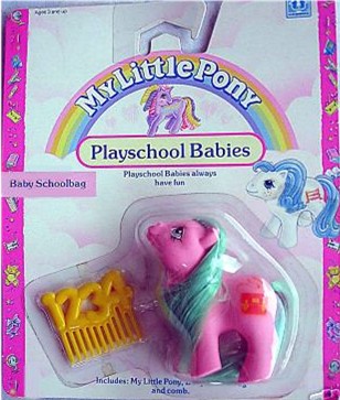 Baby Schoolbag / Baby Täschlein ist pink und hat grüne Haare. Sie hat als Zeichen, wie der Name schon sagt, eine Schultasche.