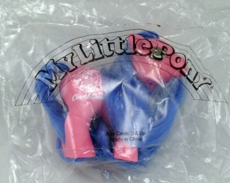 Chuck E. Cheese Baby Pony ist pink und hat blaue Haare. Ihr Symbol ist das Logo des Restaurants: eine weiße Maus und die Aufschrift.