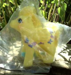 Baby Dancing Butterflies hat ein Zähnchen, Flügel, ist gelb und hat gelbe Haare. Als Symbole hat sie auf ihrem ganzen Körper Schmetterlinge. Iher Mutter ist: Dancing Butterflies (Ballerina).