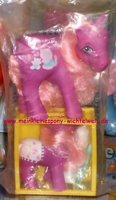 Mommy and Baby Pony sind beide lila und haben rosa Haare. Die Mutter hat als Symbol eine Katze mit einer Babykatze. Das Babypony hat eine aufgedruckte Windel mit kleinen Katzen als Zeichen.