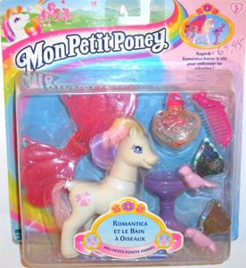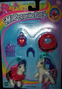 ![]() | Princess Giggles and Princess Wiggles / Prinzessin Herzchen und Prinzessin Scherzchen sind weiß und haben eine gelb-rosa bzw eine gelb-blaue Mähne und einen blauen bzw einen rosa Schweif mit Lametta. Aös Symbol haben beide einen Straus. |