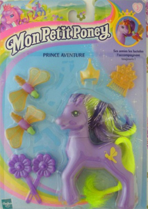 ![]() | Prince Firefly ist lila und hat eine lila-flieder-gelb-lila Mähne mit Lametta und einen gelben Schweif. Sein Symbol ist eine Libelle. |