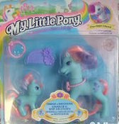 ![]() | Princess Jewel and Princess Sparkle / Prinzessin Schönchen und Prinzessin Krönchen sind hellblau und blau und haben eine blau-lila bzw eine blau-rosa Mähne und einen rosa bzw lila Schweif mit Lametta. Als Symbol haben beide einen Schlossturm. |