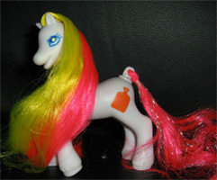 ![]() | Bubble ist weiß und hat gelb-rote Haare. Der Schweif hat Lametta. Ihr Zeichen ist eine orange Flasche. Sie bringt eine pinke Strähne mit Lametta mit. |