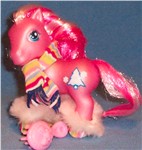 ![]() | Butterscotch / Butterblüte ist gelb (schimmert) und ihre Haare sind ebenfalls gelb und mit Lametta versehen. Ihr Zeichen ist zwei Lollies und ihr Herz ist rot. Das gelb/orange Anhängerpony schaut nach rechts. Weitere Varianten: Pretty Pony Fashions, Easter Pony. |