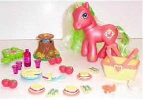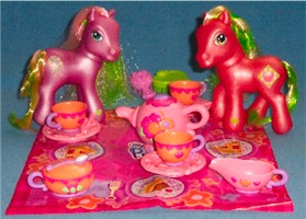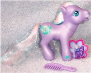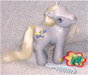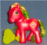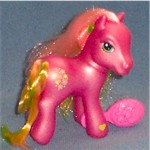 ![]() | Spring Fever / Frühlingsstern ist rosa/pink (schimmert) und hat rosa-gelb-grün-gelb-rosa Haare. Ihr Zeichen sind einige Blüten und das Herz am Bein ist grün. Weitere Varianten: Season Celebration Pony. |