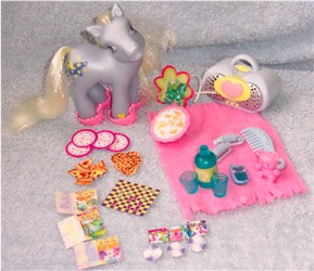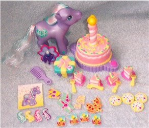 ![]() | Razzaroo / Festchen ist lila (schimmert) und hat als Zeichen ein Geschenk. Ihre Haare sind türkies-weiß-rosa-weiß-türkies-weiß-rosa-weiß-türkies gestreift und das Herz ist grün. Ihr Anhängerpony schaut nach rechts. |