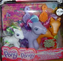 ![]() | Shenanigans / Frechdachs (schimmert) ist blau mit lila-blau-pink-weiß-lila-blau-pink-weißer Mähne. Ihr Zeichen ist ein Heißluftballon vor 2 Wolken und der Sonne. Sie hat hellblau-dunkelblaue Augen mit einem kleinen Stern drinnen. Ihre Bürste ist blau. Weitere Varianten: Pretty Pony Fashions. |