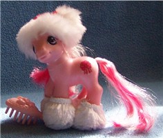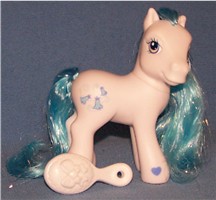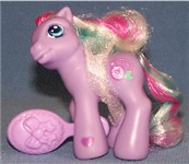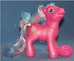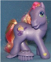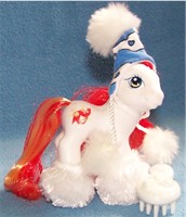 ![]() | Misty Blue ist weiß und hat blaue Haare mit Lametta. Ihr Zeichen sind drei Blüten. |
