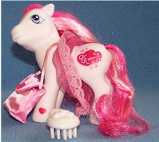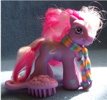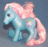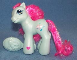 | Boogie Woogie ist türkis (schimmert) hat hat pinke Haare mit Lametta. Als Zeichen hat sie Klaviertasten, Noten und einen Scotchterrier. Das Herz an ihrem Huf ist pink. |