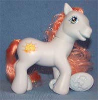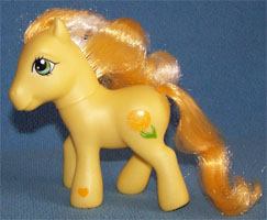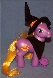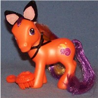 | Pumpkin Tart ist orange (schimmert) und hat eine lila-gelb-orange-gelb-lila Mähne und einen lila Schweif. Als Symbol hat sie eine Katze und einen Mond. |
