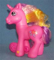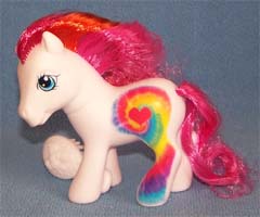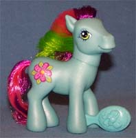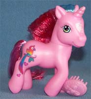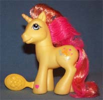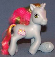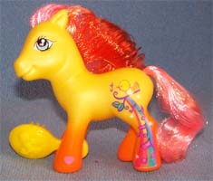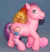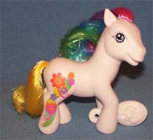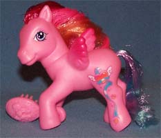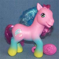 ![]() | Comet Tail / Kometenschauer ist rosa mit gelben Hufen und orangen Beinen. Ihre Haare sind pink-gelb- dunkelpink. Das Zeichen ist ein Stern mit Bändern, die am Bein runterlaufen. |