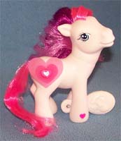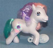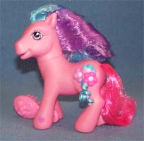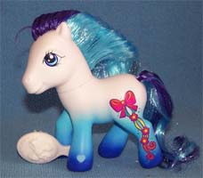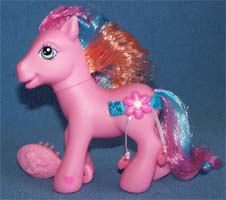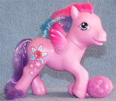 ![]() | Blushie / Morgenrot ist pink und hat eine blau-lila Mähne und einen pinken Schweif. Ihr Zeichen sind 3 3-D Blüten mit zwei echten blauen Bändern. Das Herz ist lila. |