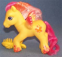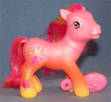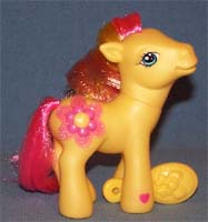 ![]() | Peach Blossom / Pfirsichblume ist gelb (schimmert) und hat eine pink-gelb-dunkelpfirsichfarbene Mähne und einen pinken Schweif. Sie hat eine 3D Blüte als Zeichen. |