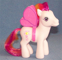 ![]() | Dancing Daffodil / Sonnenelfchen ist gelb und hat eine pink-gelbe Mähne und einen pinken Schweif. Als Zeichen hat sie Blüten. |