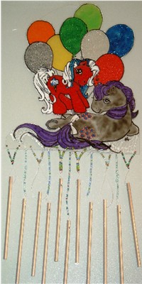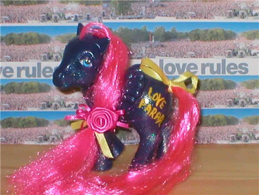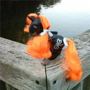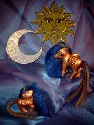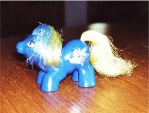 Mein Custom zählt zur Kategorie "Sternzeichen-Babyponys". Leider ist mir kein schöner Name dafür eingefallen. Als Zeichen hat es einen silbernen Stierkopf bekommen, der leider auf dem Foto nicht so gut zu erkennen ist. Ursprünglich hieß das Pony mal Baby Tapsi und war ziemlich vollgemalt. Die blaue Strähne stammt von Blumenglöckchen.