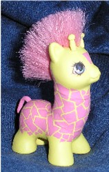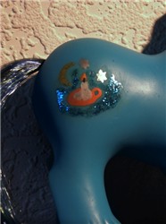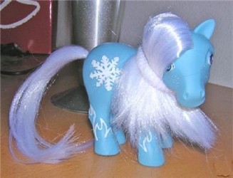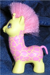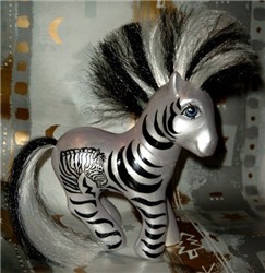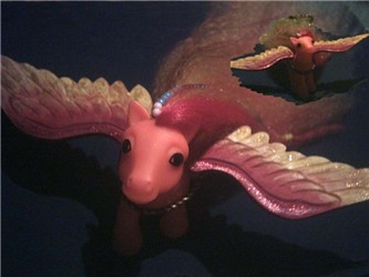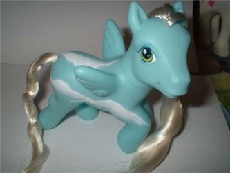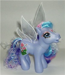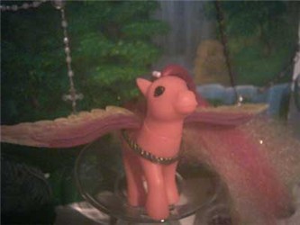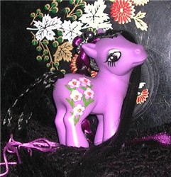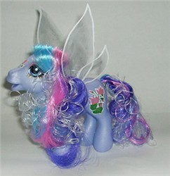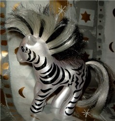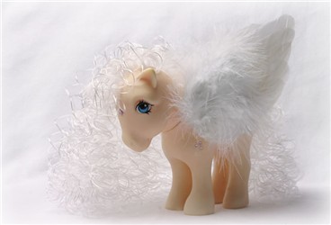 ![]() | Seraphine Die Kleine war mal eine italienisches Cotton Candy, die in ihrem früheren Leben fürchterlich misshandelt wurde. Als ich sie aus Mitleid für 20 Cent auf einem Flohmarkt kaufte, war sie völlig ausgeblichen, hatte ein Loch im Bauch (sah aus wie von einem Bleistift erstochen), Flecken und kaum noch Mähne. Nur ihr Schweif war noch super (den hat später meine Macau Snuzzles bekommen). Es lag nahe, aus einem Pony, das in seinem Leben einen Schutzengel gebraucht hätte, selbst einen kleinen Engel zu machen und die Idee für einen Engel hatte ich, seitdem ich die Flügel mal in einem Bastelladen gefunden hatte. Die Haare sind Puppenhaare ebenfalls aus dem Bastelgeschäft und die kleinen Glitzeraufkleber stammen ursprünglich aus einer alten Bravo. |