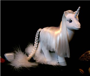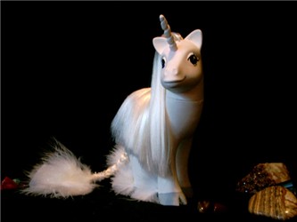 ![]() ![]() | Das letzte Einhorn Ich hatte mir vorgenommen, eine Replica des Einhorns zu machen, so gut es nur irgend möglich war. Dabei hatte ich folgende Anhaltspunkte: Für die gespaltenen Hufe schnitt ich jeweils eine Kerbe in jeden Lauf des Ponys, füllte kleine Löcher, die dabei entstanden dann mit Modelliermasse zu. Das Horn entstand aus einem chinesischen Esstäbchen, welches ich mit einem Schnitzmesser und Schmirgelpapier bearbeitet habe. Das war nötig, da die normalen Ponyhörner einfach nicht lang genug sind. In den Kopf wurde an der Stelle, wo einmal das Horn hin sollte, ein Loch gebohrt und das Horn hineingesteckt und festgeklebt. Dann wurde das Pony mit weißem Acryllack eingepinselt und die entsprechenden Merkmale (graue Hufe, blaue Augen) gezeichnet. Anschließend ging ich mit einem hauchzarten Rosa über die dünnsten Stellen, die die Haut im Realfall haben würde und verwischte diese Farbe mit einem Wattestäbchen, damit es natürlicher aussah. Für den Fesselbehang musste ich wieder kleine Löcher an den Läufen bohren, wo ich Dekofedern hineinsteckte und innen verklebte. Die Dekofedern schnitt ich noch entsprechend kurz, aber nicht zu kurz, so dass es passte. Die Haare sollten bis zur Mitte des Rückens reichen, deswegen musste ich wieder auf meinen Bohrer zurückgreifen. Nach dem Bemähnen des Einhorns wurde der Schweif noch geflochten. Die Quaste des Stierschwanzes ließ mich überlegen und mir fielen die Dekofedern wieder ein, von denen ich noch ein paar kleine übrig hatte und die sich eigentlich perfekt dafür eigneten, die Quaste darzustellen. |