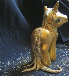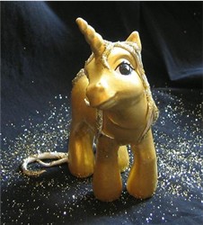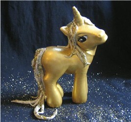![]() ![]() ![]() | Goldenes Einhorn Bei Harry Potter wird erzählt, dass Einhörner mit goldenem Fell auf die Welt kommen und erst nach ein paar Jahren silber werden. Dieses Einhorn ist noch jung, aber wird bald das Fell und die Farbe wechseln. Es hat mit der Melancholie des Erwachsenwerdens zu kämpfen, deswegen auch die traurigen, dunklen Augen. Material: Das Horn und die Haare sind aus Modeliermasse. Sie ist mit Acrylfarbe bemalt und die Haare sind zusätzlich mit Goldflitter bestreut. |