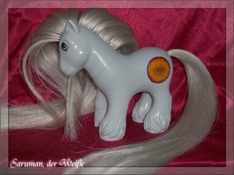 ![]() ![]() ![]() ![]() | Saruman der Weiße Serie : Die Ponys der Ringe Material : Genötigt wurde ein armer, alter Booti. Seine Wallemähne ist aus Kunsthaaren aus einem Afroshop. Bemalt wurde er mit Acryllack, sein Symbole und Augen wurden mit Revellack gemalt. Symbole : zu sehen ist auf seiner Displayseite (in diesem Fall die auf der die Mähne nicht liegt) „Das Auge“ . Wer die Geschichte vom Herrn der Ringe nicht kennt, Das Auge ist das Symbol für den Bösewicht, es stellt ihn als körperloses Wesen da. Es sieht alles und weiß alles. Auf der NonDisplayseite ist die Weiße Hand Sarumans zu sehen. Sie ist das Symbol der Ork Batalionen, die der böse Zauberer Saruman in den Krieg gegen die freien Völker Mittelerdes schickt. |