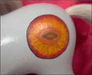 ![]() ![]() ![]() | Name: Tribal Fire Symbol: - Art: Phönix-Pony Das Pony wurde mit rotem und gelbem Haar rehaired und eine Strähne in der Mähne wurde mit Perlen dekoriert. Zwei Dekoholzflügel wurden rot und gelb angemalt, mit Nägeln am Rücken befestigt und erhielten zum Schluß noch ein wenig Glitzer. Ein zurechtgebogenes Kupfer-Armband macht den Tribal-Look perfekt. |