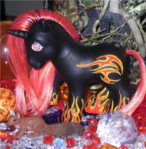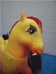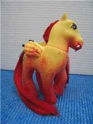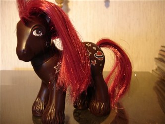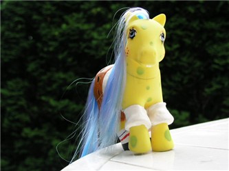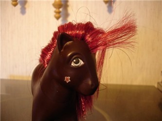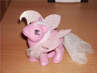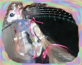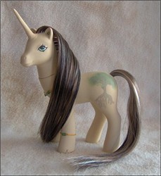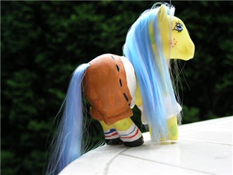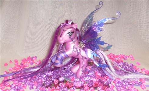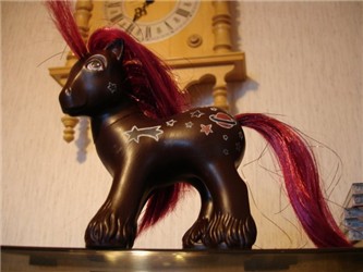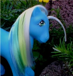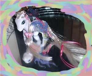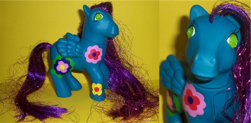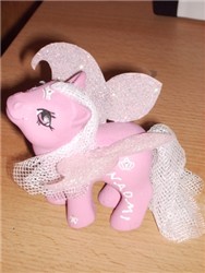![]() ![]() | Stardust Dieses Custom ist unter Einsatz meines Lebens aus "Silver Rain" entstanden (Liebe Kinder, denkt immer daran die Fenster zu öffnen, wenn ihr Universalverdünnung benutzt! ;-). Nach gefühlten 10 Stunden hatte ich dann endlich die Symbole entfernt und konnte mit Acrylfarbe neue aufmalen. Dieses Pony wurde mit dollyhair-Haaren rehairt. Die Flügel sind aus Plastik und wurden von mir ganz alleine mit einer Schere ausgeschnitten und formschön mit diesem Glitzerkleberzeug bemalt. Den Haarschmuck habe ich selbst gekauft. ;-) |