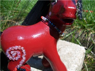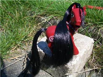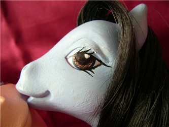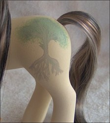 ![]() ![]() ![]() ![]() | Gayalha Diese Pony ist der zum Leben erweckte Rollenspielcharakter Gayalha, die Erdmagierin. Sie ist teil unseres Foreninternen Rollenspiels, wer also mehr Infos zu ihrem Charakter oder zur laufenden Geschichte lesen möchte wendet sich am besten an die Spieler J. Als Vorlage gab es nur ein einziges Bild. Ihr könnt die Zeichnung hier sehen. Gaya war in ihrem früheren Leben eine ganz normale Sweet Heart Sister… bis sie mir in die Hände fiel. Oke, ganz perfekt war sie nicht mehr, daher war es nicht so schlimm sie zu köpfen ;) Bemalt ist sie mit Marabu Mattfarbe Milchkaffee mit einem Schuss schwarz. Ihr Symbol, der Baum, ist ebenfalls damit gemalt, wie auch die Rune an ihrem Fuss und auf ihrer Wange auf der NDS. Besonders schwierig herzustellen war der passende Schmuck Letztendlich bekam sie winzige Perle auf Garn gefädelt. Ich habe so gut es ging versucht die Kette nachzubauen. Ihr Ohrloch ziert übrigens genau so eine Perle ;) Ihre Mähne und der Schweif wurden mit Dollyhair gemacht und bestehen aus drei Farben : schwarz, amaretto und weiß. Sie zu machen hat sehr viel Spaß gemacht. |