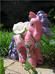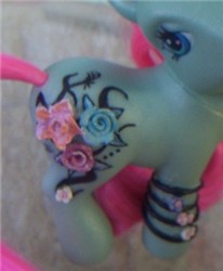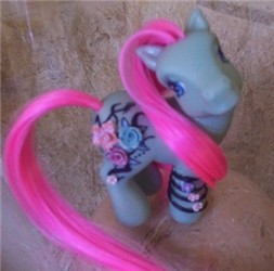 ![]() ![]() ![]() | Loving Rose Ihr Name ist Loving Rose sie wurde aus einem nicht mehr all so hübschen G3 Minty hergestellt. Ihre Rosen ebenso wie der beinschmuck wurden aus Fimo gebastelt und mit viel Mühe an dem Pony befestig ;)Sie hat neue haare bekommen in der Farbe >Pink Hot< Die Symbole wurden mit einem Teil Ölfarbe und einem Teil Acryl Farbe bemalt |